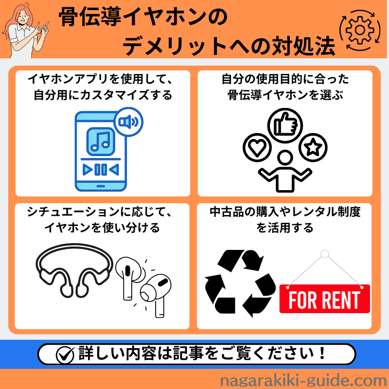 上で挙げた骨伝導イヤホンのデメリットへの対処法は以下のとおりです。