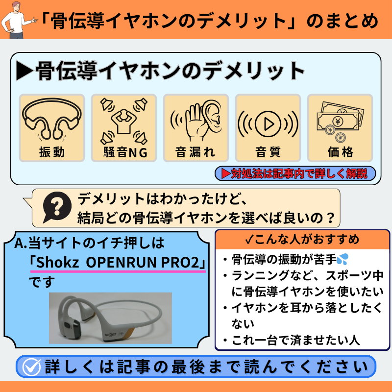 この記事では、骨伝導イヤホンのデメリットとその対策を解説しました。