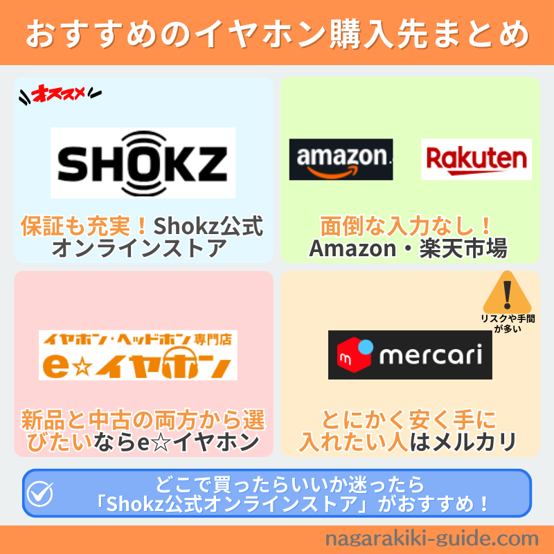 イヤホンを選ぶときには形状や装着感も考えて選びましょう。最近では家電量販店でもShokz製品の試着が可能な場合があります。ぜひ活用してください。