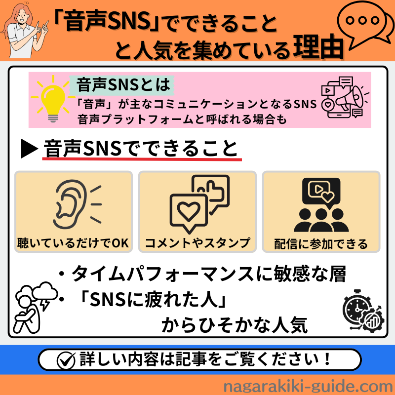 テキストや画像ではなく、「声」を主体としてコミュニケーションを行うSNSの総称です。