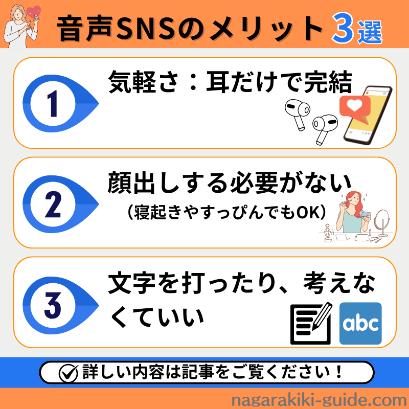 音声SNSの魅力やメリットは以下のとおりです。