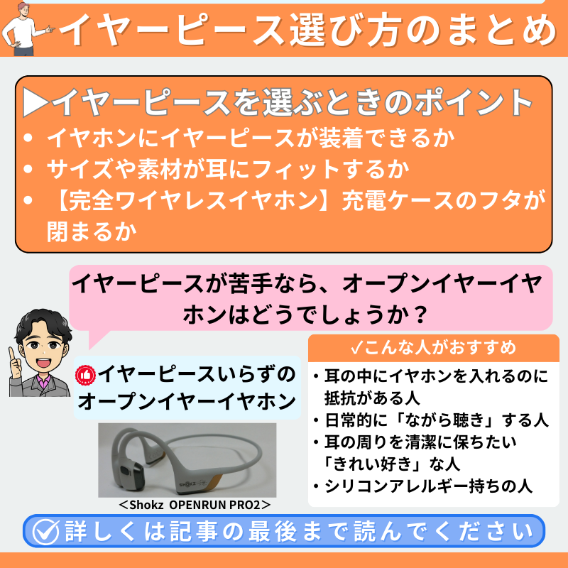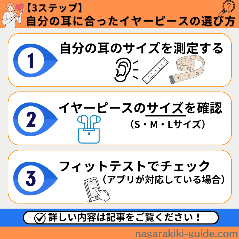 イヤーピースを選ぶときには、以下の3点に注意しましょう。