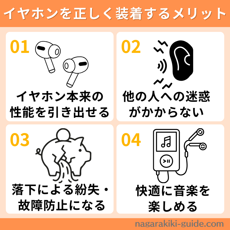 イヤホンを正しく付けると、以下のメリットがあります。