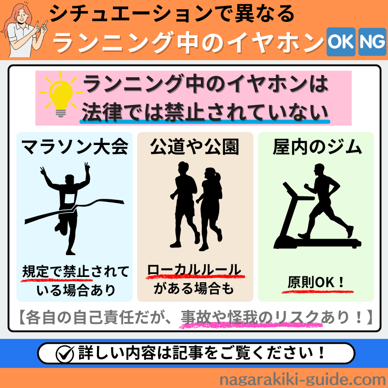 ランニング中のイヤホン使用は一般的に禁止されていませんが、大会によっては禁止規則がある点に注意しましょう。ランニング中に音楽を聴くと楽しく、パフォーマンスも向上しますが、同時にリスクも伴います。周囲の音が聞こえにくくなるため、安全性が低下します。