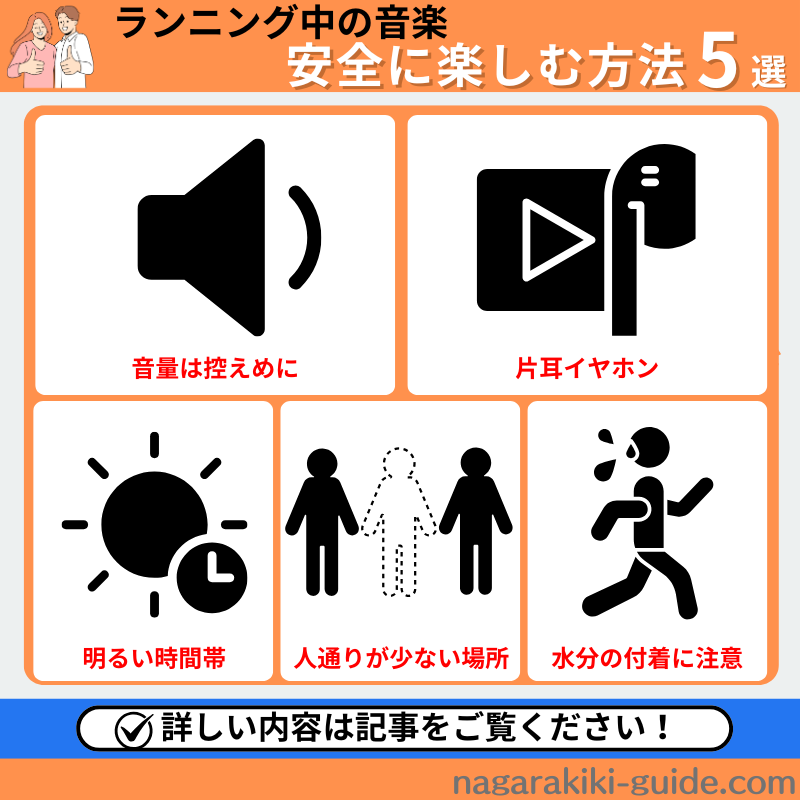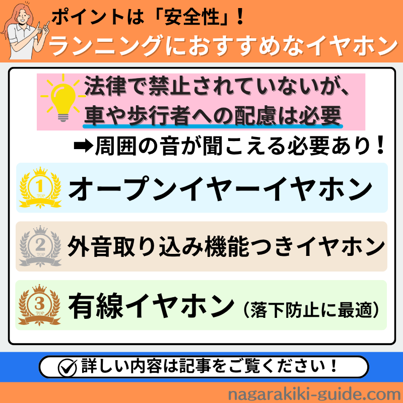 安全にランニングを楽しむためには、骨伝導タイプや外音取り込み機能つきのイヤホンを選び、周囲の状況に意識を向けながら走るのがおすすめです。
