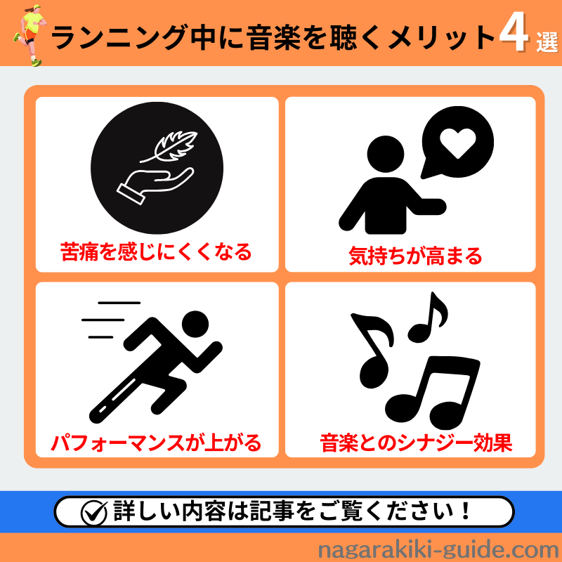 エンドルフィン(幸福感を高めるホルモン)の分泌が促され、ランニングを楽しめるようになるのもメリットです。音楽で脳が刺激されると、他のことに意識が向きやすくなり、身体の痛みや違和感が軽減されます。