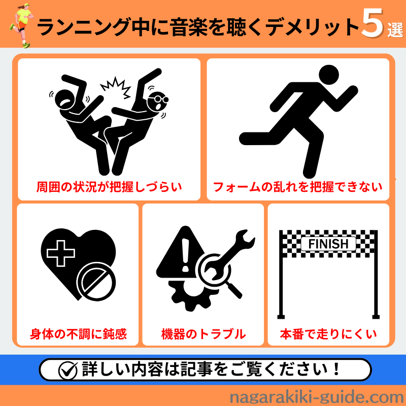 ランニング中にイヤホンで音楽を聴くなら、デメリットも把握しておきましょう。主なデメリットは以下のとおりです。