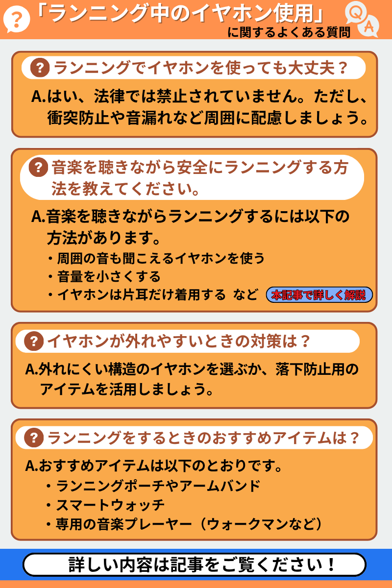 ランニング中のイヤホン使用に関するよくある質問は、以下のとおりです。