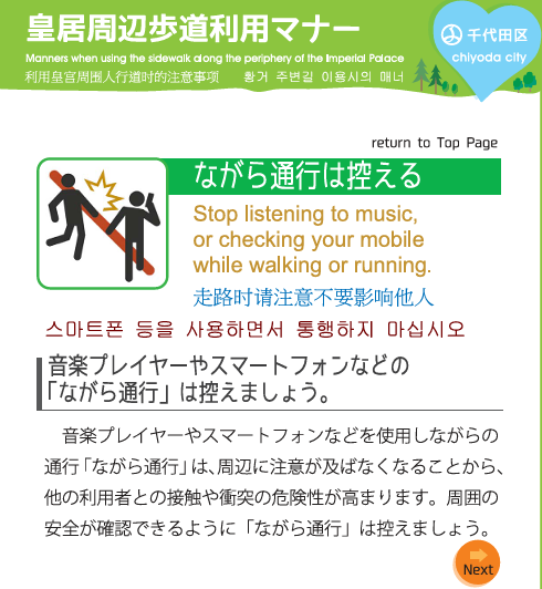 例えば、以下は皇居ランで人気の東京都千代田区の注意喚起です。